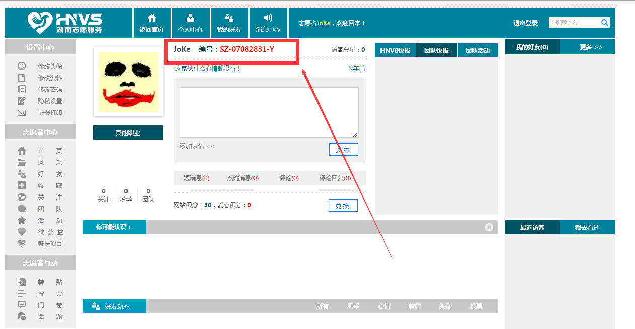 1、登录湖南志愿者账号,进入个人中心( 网址:https://www.hnvs.cn/~);