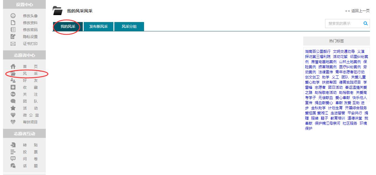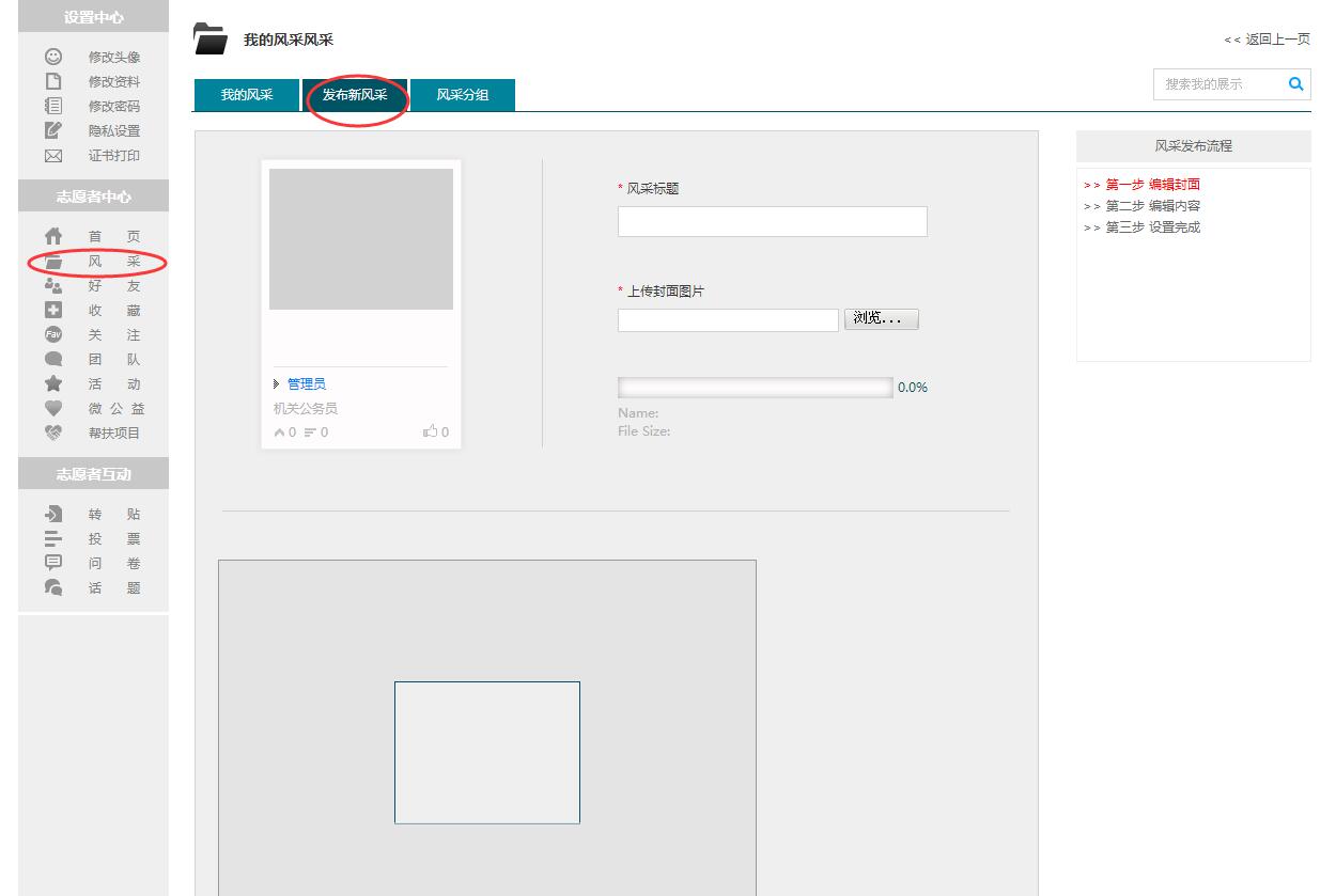 2、点击左侧菜单栏中“志愿者中心》风采》“发布风采”按钮进入发布文章栏目