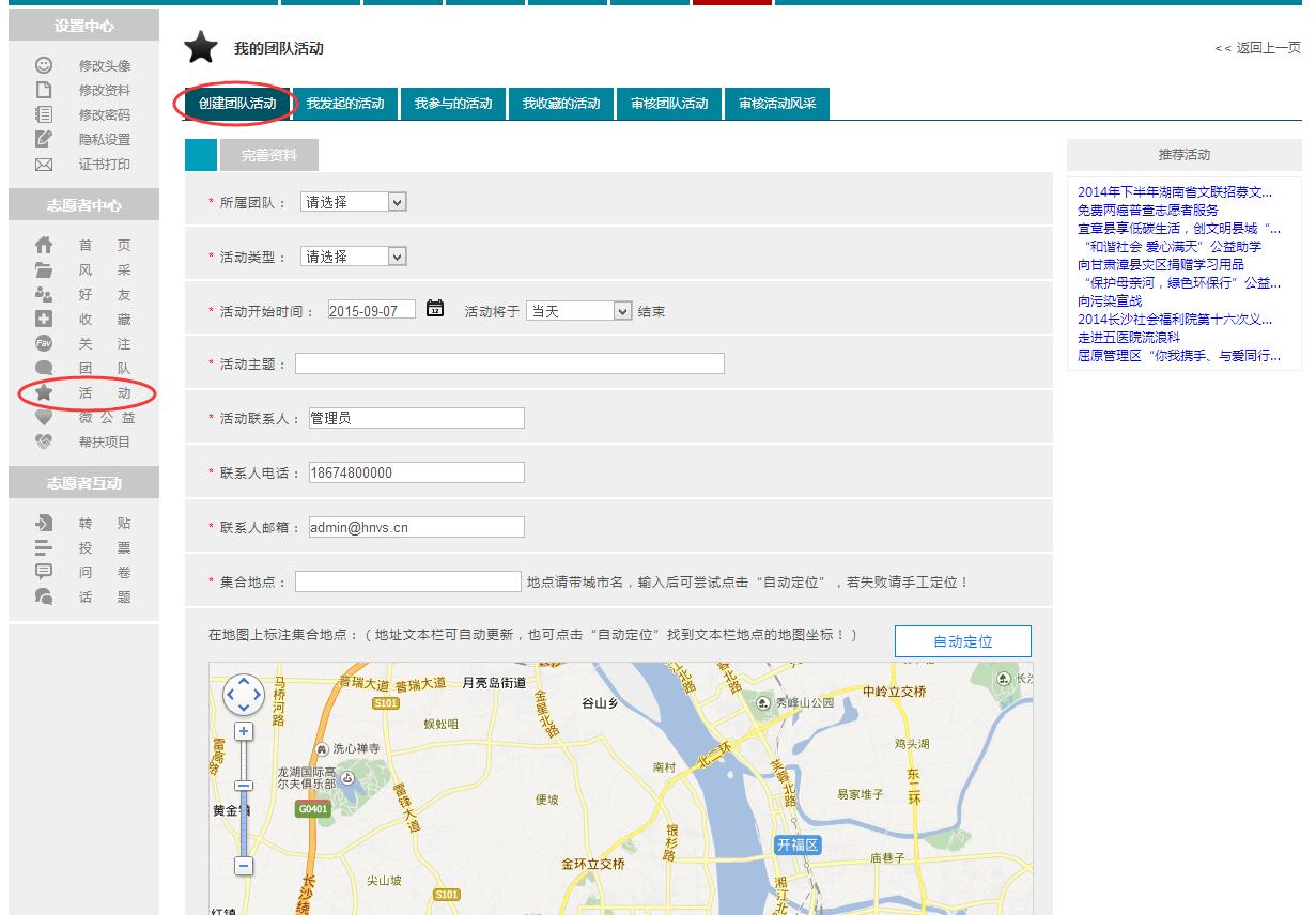 2、点击左侧菜单栏中“志愿者中心》活动》“创建团队活动”按钮进入发布文章栏目