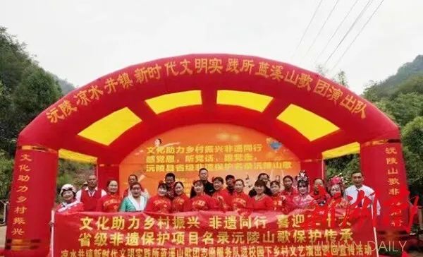 在凉水井镇涟泗溪村,凉水井镇新时代文明实践所蓝溪山歌团志愿服务队正在开展文化下乡村活动,给当地群众送去了一顿文化大餐。《红军不怕远征难》《听党话感党恩跟党走》以山歌形式回顾了党的光辉历程,歌颂了党的丰功伟绩;三句半《文化助力乡村振兴》,宣传了乡村振兴政策,描绘了乡村振兴美好蓝图。
