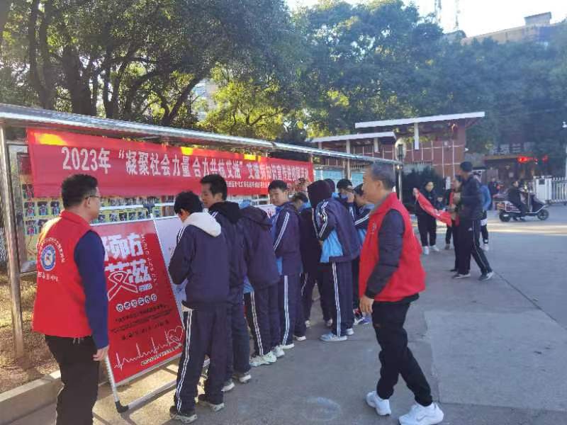为了宣传普及科学预防艾滋病知识,增强学生预防控制艾滋病的意识,营造全民参与艾滋病防治的良好氛围,金鹗山街道新时代文明实践所联合螺丝港、良万社区新时代文明实践站在岳阳市第六中学开展2023年“凝聚社会力量 合力共抗艾滋”艾滋病和识宣传进校园活动。