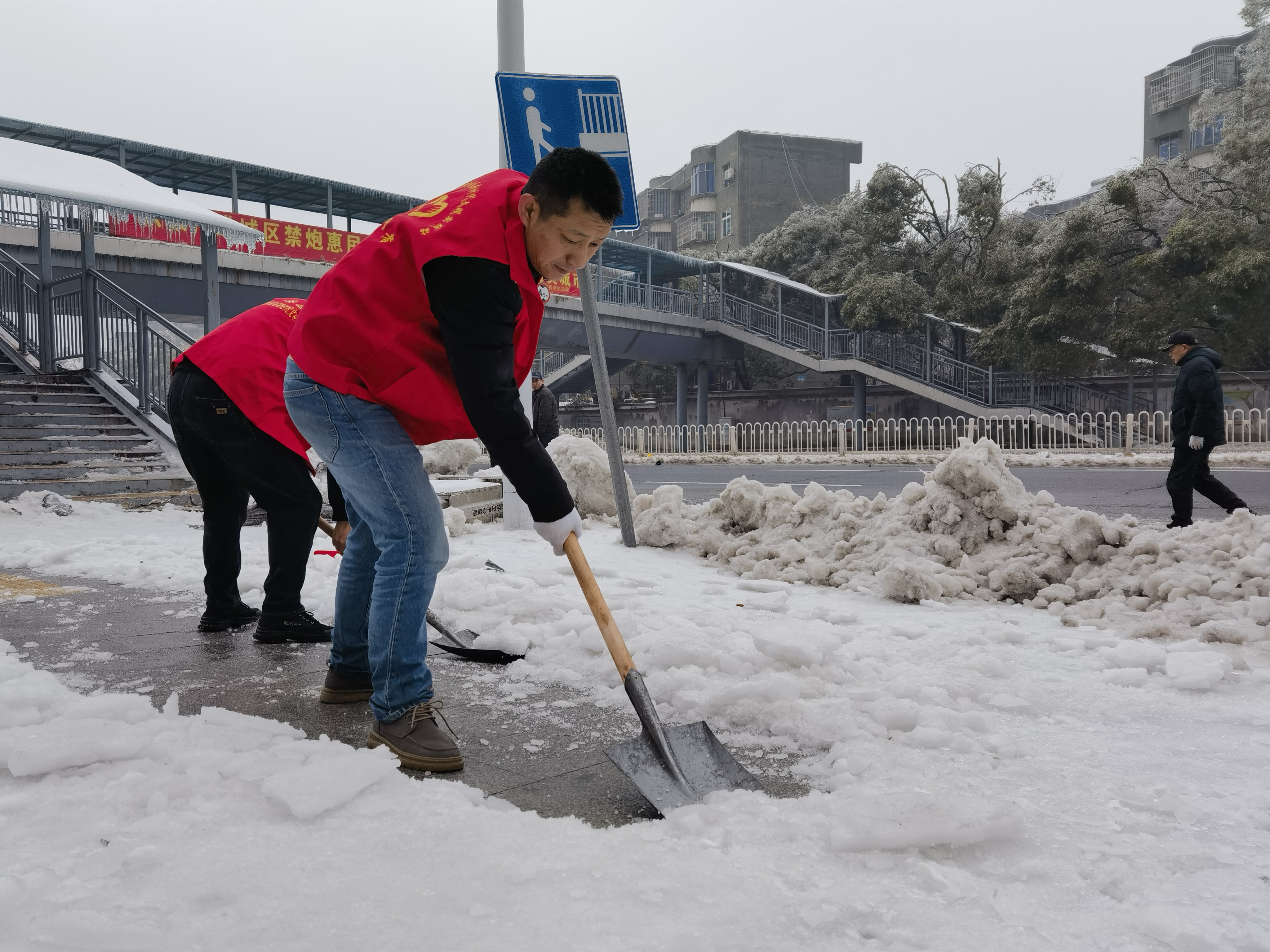 2月7日下午,社区召集志愿者在辖区内主要出行道路口进行铲雪除冰。
